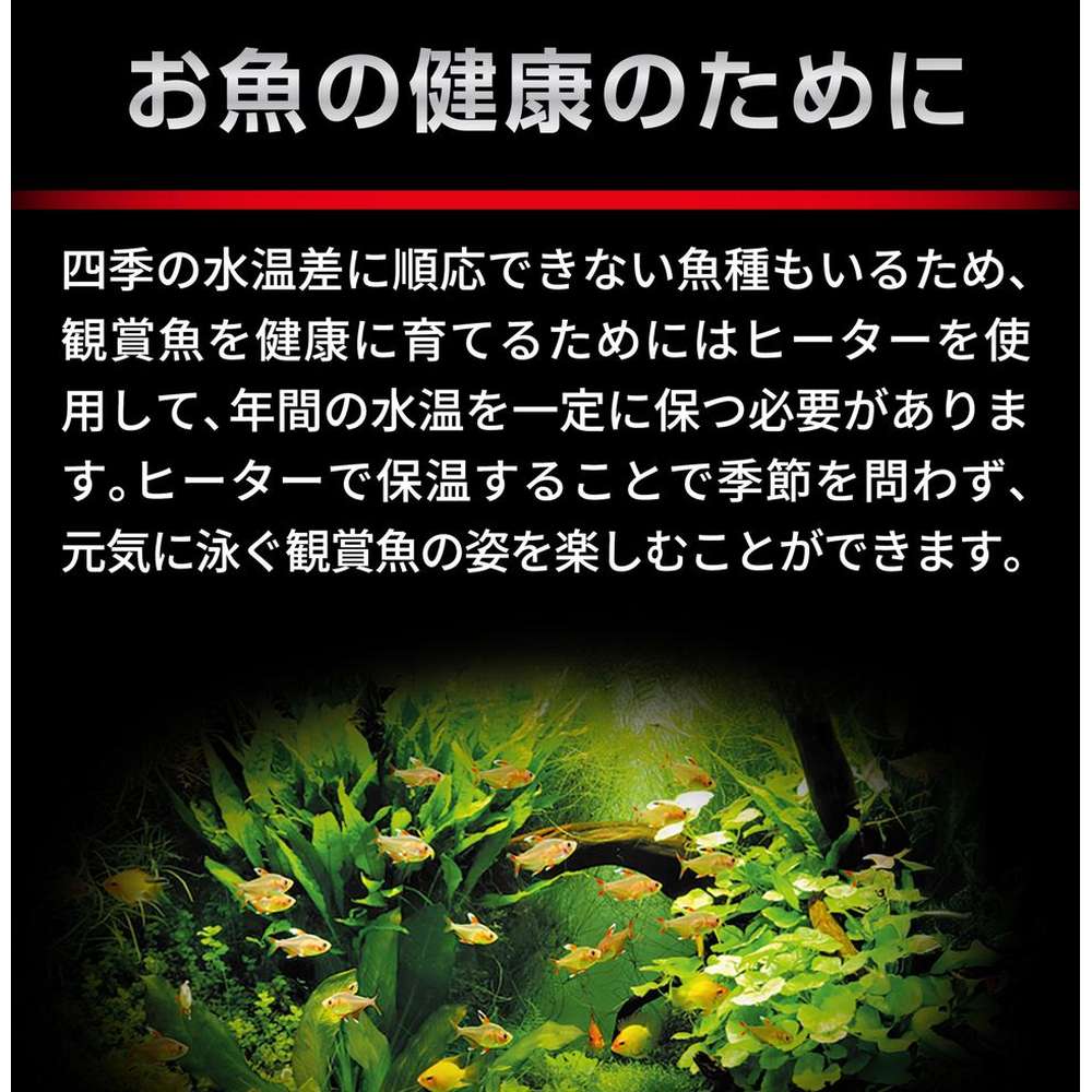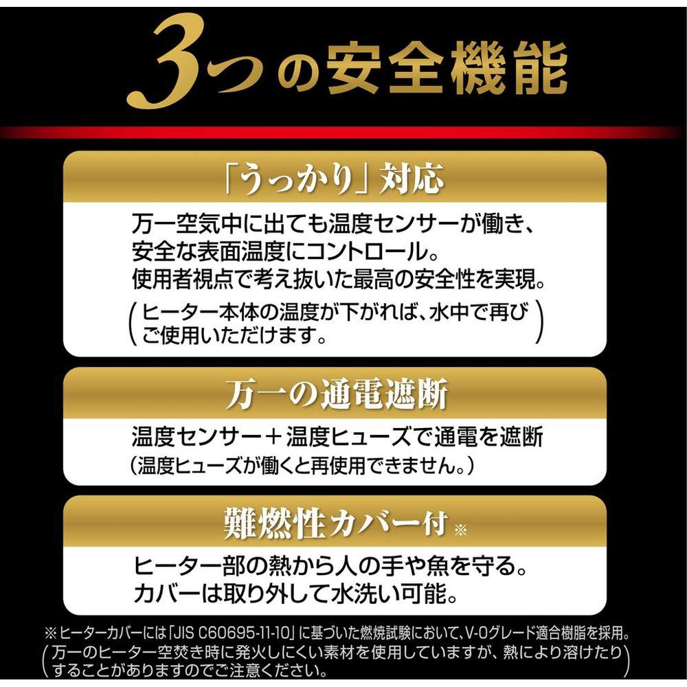 □難燃性樹脂を使用したヒーターカバーがついているので、人にも魚にも安全です!!