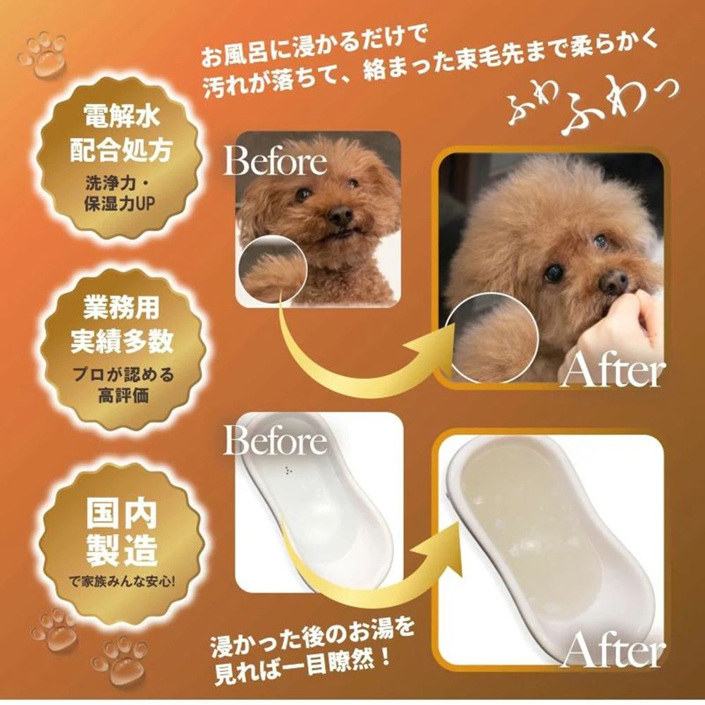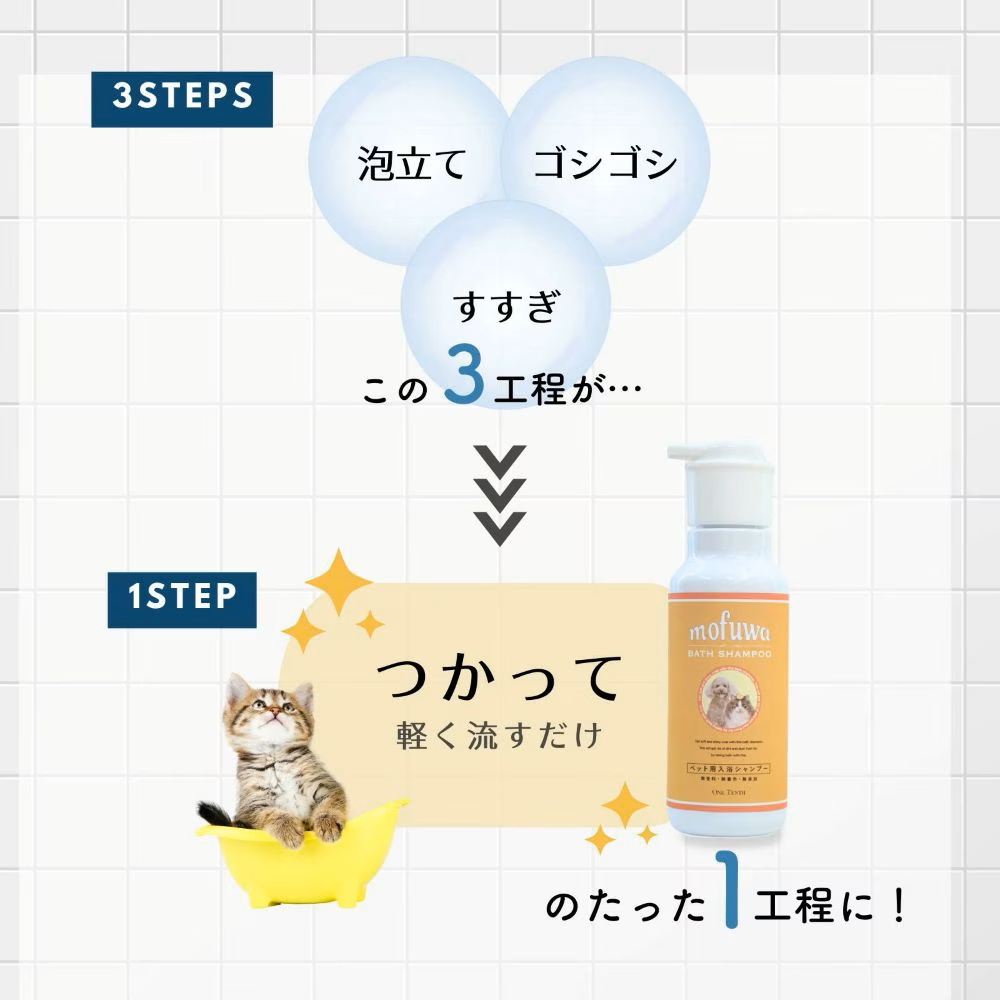 | 素材 | 水※、コカミドプロピルベタイン、ヤシ油脂肪酸PEG-7グリセリル、オレフィン(C14-16)スルホン酸Na、ココイルグルタミン酸2N、パパイン、ソルビトール、セラミドAP、セラミドNP、イソペンチルジオール、ベタイン、PPG-3カプリリルエーテル、フナバラソウエキス、アラニン、アルギニン、グリシン、セリン、カキタンニン、BG、乳酸、乳酸Na、デキストリン、ダイズタンパク、PEG-60水添ヒマシ油、ペンテト酸5Na ※高い洗浄・膨潤効果を持つ「mofuwaグルーミングスプレー」を原料水として製造 |