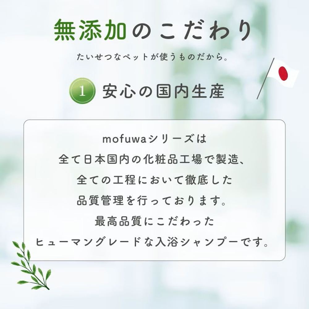 □mofuwaシリーズは全て日本国内の化粧品工場で製造、全ての工程において徹底した品質管理を行っております。大切な家族に使うものだからこそ、最高品質にこだわったヒューマングレードな入浴シャンプーです。
