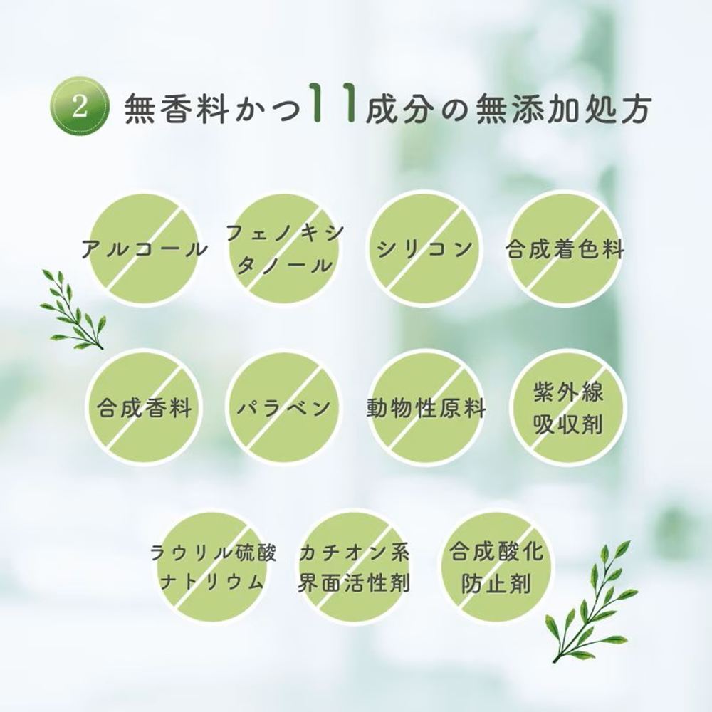 11成分:アルコール、フェノキシタノール、シリコン、合成着色料、合成香料、パラベン、動物性原料、紫外線吸収剤、ラウリル硫酸ナトリウム、カチオン系界面活性剤、合成酸化防止剤