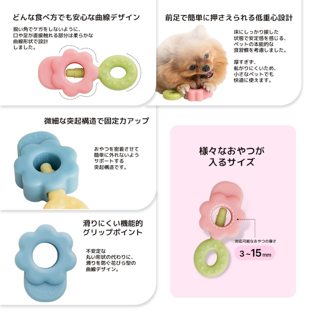 □直径3〜15mmのおやつに対応し、お出かけにも便利なコンパクトサイズ。