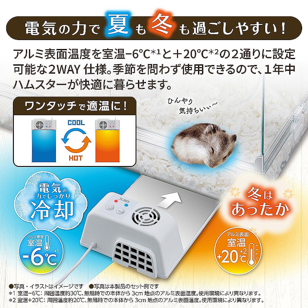 □夏冬兼用の2WAY仕様で1年中快適。電気を流す方向で温冷が切り替わる「ペルチェ素子」を採用!アルミ表面温度を、夏場は「室温マイナス6度」、冬場は「室温プラス20度」の2通りに設定でき、季節を問わず使用可能。