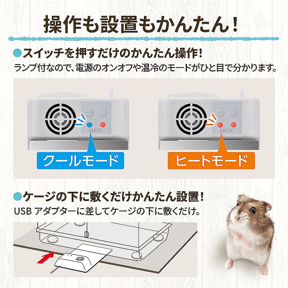 □ケージの下に敷くだけ簡単!。USBアダプターに差し込んでケージの下に敷くだけで設置が完了します。ケージの外に置くため、お手入れ簡単!