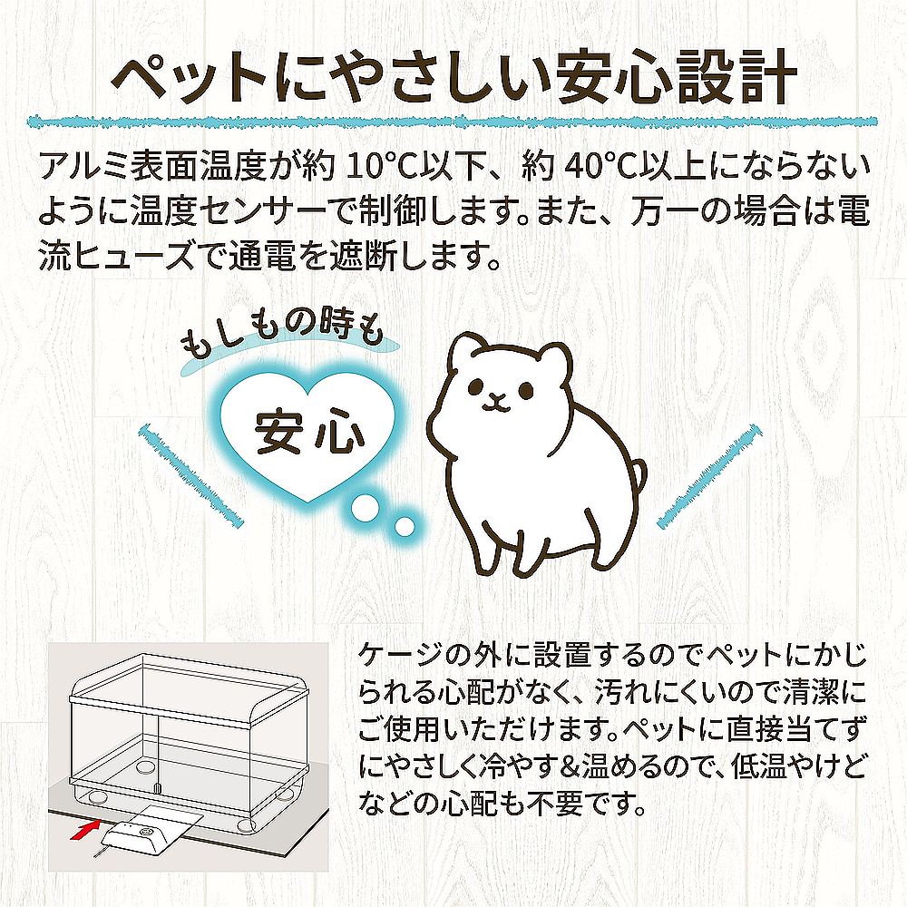 □異常過熱などを防ぐ安心の安全設計。温度センサーを搭載しており、アルミ表面温度が約10度以下、または約40度以上にならないよう制御します。また、万が一の異常時には電流ヒューズで通電を遮断する仕組みに。