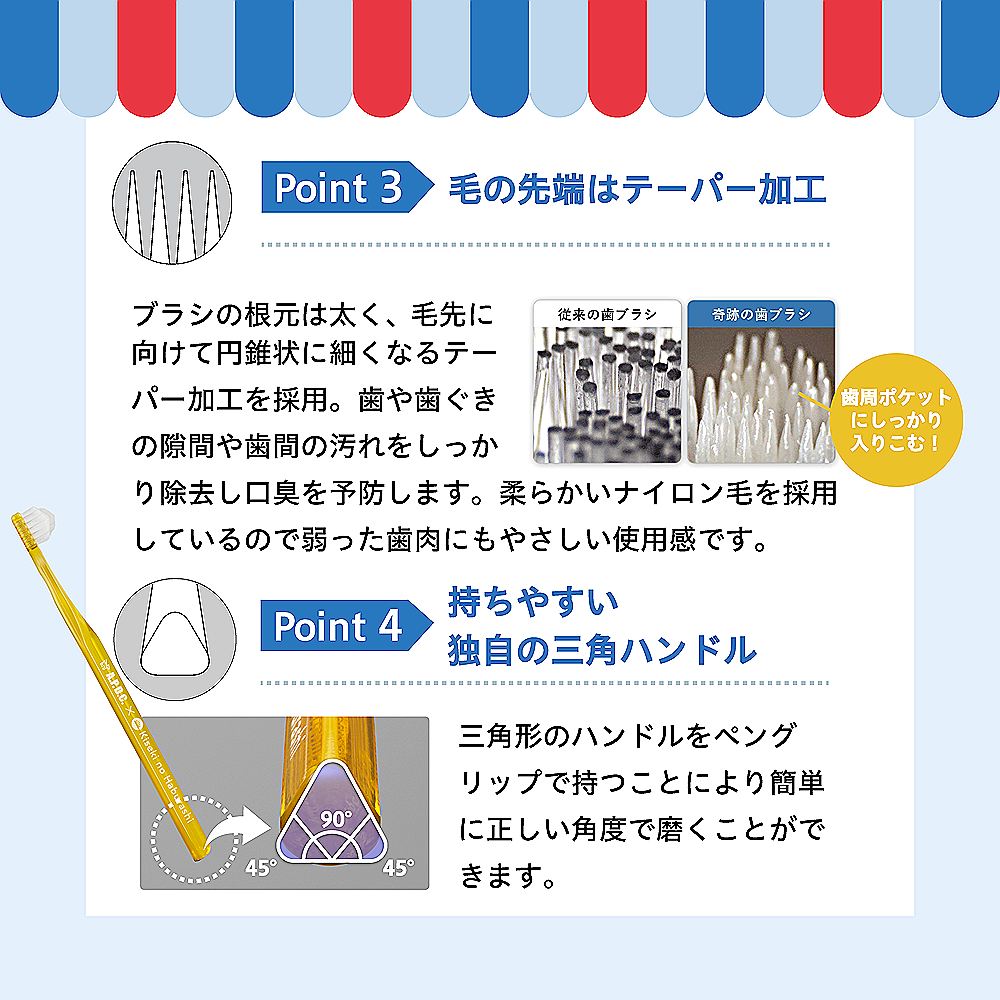 ブラシの根元は太く、毛先に向け円錐状に細くなるテーパー加工を採用。歯や歯ぐきの隙間やニオイの元となる歯周ポケットの汚れをしっかり除去します。柔らかいナイロン毛を採用しているので弱った歯肉にもやさしい使用感です。